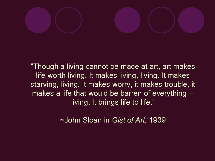 "Though a living cannot be made at art, art makes life worth living. It makes living, living. It makes starving, living. It makes worry, it makes trouble, it makes a life that would be barren of everything -- living. It brings life to life. “ ~John Sloan in Gist of Art, 1939