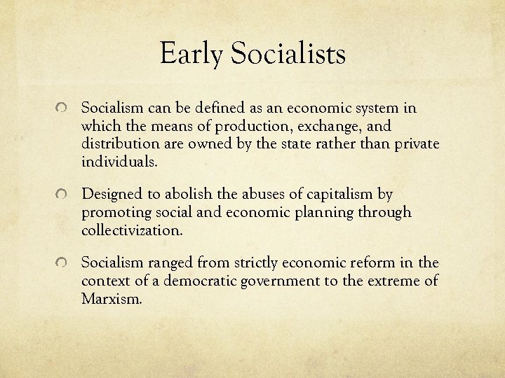 Early Socialists Socialism can be defined as an economic system in which the means of production, exchange, and distribution are owned by the state rather than private individuals. Designed to abolish the abuses of capitalism by promoting social and economic planning through collectivization. Socialism ranged from strictly economic reform in the context of a democratic government to the extreme of Marxism.