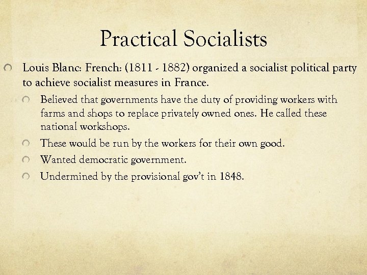 Practical Socialists Louis Blanc: French: (1811 - 1882) organized a socialist political party to achieve socialist measures in France. Believed that governments have the duty of providing workers with farms and shops to replace privately owned ones. He called these national workshops. These would be run by the workers for their own good. Wanted democratic government. Undermined by the provisional gov’t in 1848.