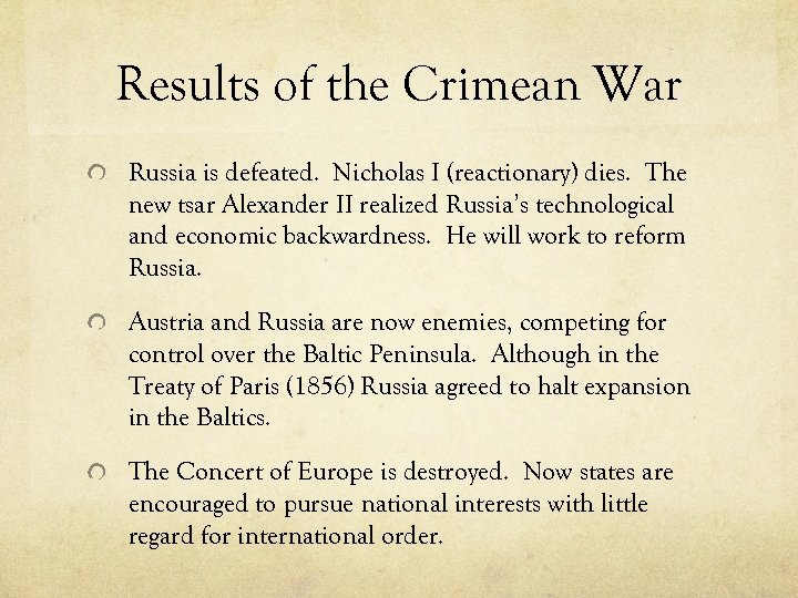 Results of the Crimean War Russia is defeated. Nicholas I (reactionary) dies. The new tsar Alexander II realized Russia’s technological and economic backwardness. He will work to reform Russia. Austria and Russia are now enemies, competing for control over the Baltic Peninsula. Although in the Treaty of Paris (1856) Russia agreed to halt expansion in the Baltics. The Concert of Europe is destroyed. Now states are encouraged to pursue national interests with little regard for international order.