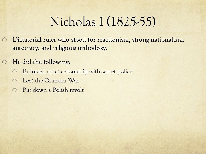 Nicholas I (1825 -55) Dictatorial ruler who stood for reactionism, strong nationalism, autocracy, and religious orthodoxy. He did the following: Enforced strict censorship with secret police Lost the Crimean War Put down a Polish revolt