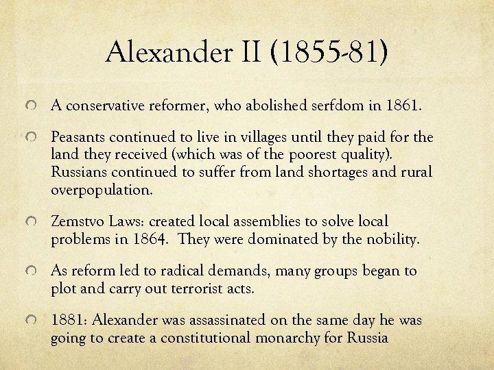 Alexander II (1855 -81) A conservative reformer, who abolished serfdom in 1861. Peasants continued to live in villages until they paid for the land they received (which was of the poorest quality). Russians continued to suffer from land shortages and rural overpopulation. Zemstvo Laws: created local assemblies to solve local problems in 1864. They were dominated by the nobility. As reform led to radical demands, many groups began to plot and carry out terrorist acts. 1881: Alexander was assassinated on the same day he was going to create a constitutional monarchy for Russia