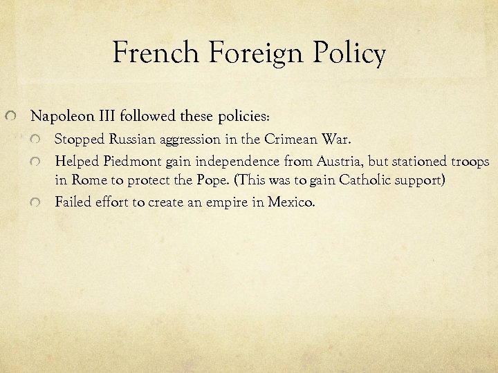 French Foreign Policy Napoleon III followed these policies: Stopped Russian aggression in the Crimean War. Helped Piedmont gain independence from Austria, but stationed troops in Rome to protect the Pope. (This was to gain Catholic support) Failed effort to create an empire in Mexico.