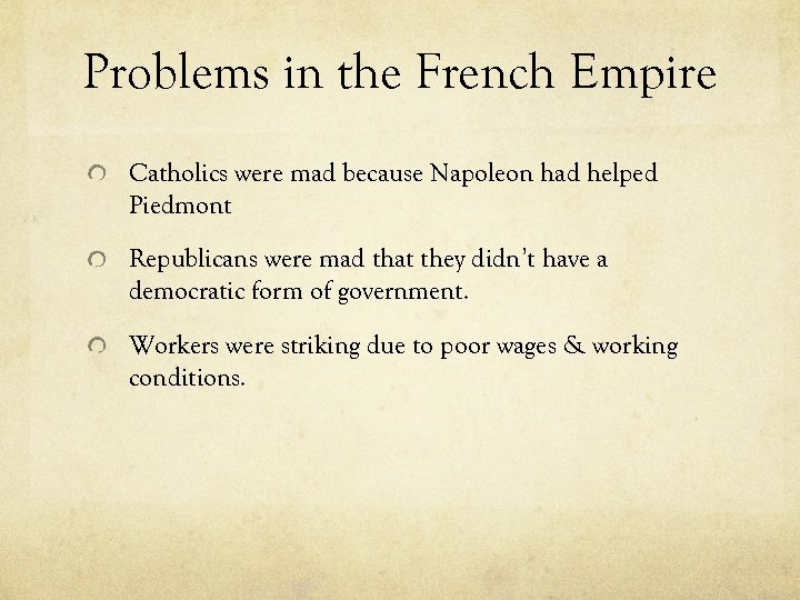 Problems in the French Empire Catholics were mad because Napoleon had helped Piedmont Republicans were mad that they didn’t have a democratic form of government. Workers were striking due to poor wages & working conditions.