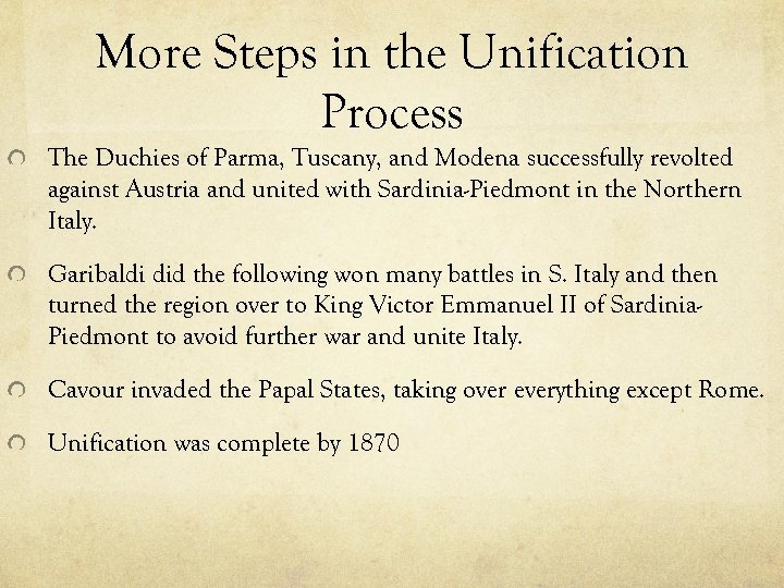 More Steps in the Unification Process The Duchies of Parma, Tuscany, and Modena successfully revolted against Austria and united with Sardinia-Piedmont in the Northern Italy. Garibaldi did the following won many battles in S. Italy and then turned the region over to King Victor Emmanuel II of Sardinia. Piedmont to avoid further war and unite Italy. Cavour invaded the Papal States, taking over everything except Rome. Unification was complete by 1870