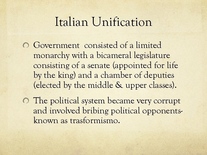 Italian Unification Government consisted of a limited monarchy with a bicameral legislature consisting of a senate (appointed for life by the king) and a chamber of deputies (elected by the middle & upper classes). The political system became very corrupt and involved bribing political opponentsknown as trasformismo.