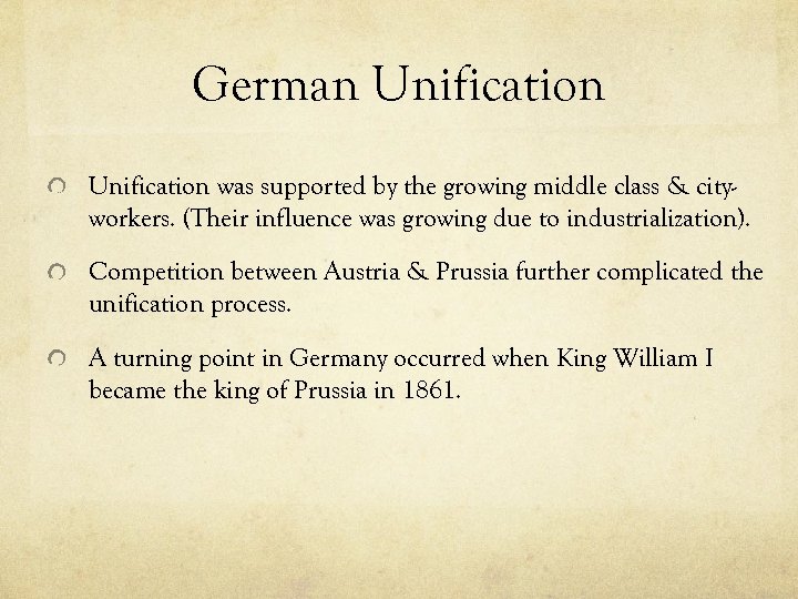 German Unification was supported by the growing middle class & cityworkers. (Their influence was growing due to industrialization). Competition between Austria & Prussia further complicated the unification process. A turning point in Germany occurred when King William I became the king of Prussia in 1861.