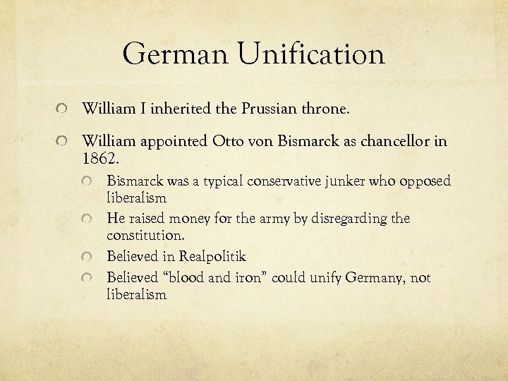 German Unification William I inherited the Prussian throne. William appointed Otto von Bismarck as chancellor in 1862. Bismarck was a typical conservative junker who opposed liberalism He raised money for the army by disregarding the constitution. Believed in Realpolitik Believed “blood and iron” could unify Germany, not liberalism