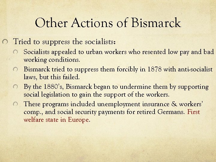 Other Actions of Bismarck Tried to suppress the socialists: Socialists appealed to urban workers who resented low pay and bad working conditions. Bismarck tried to suppress them forcibly in 1878 with anti-socialist laws, but this failed. By the 1880’s, Bismarck began to undermine them by supporting social legislation to gain the support of the workers. These programs included unemployment insurance & workers’ comp. , and social security payments for retired Germans. First welfare state in Europe.