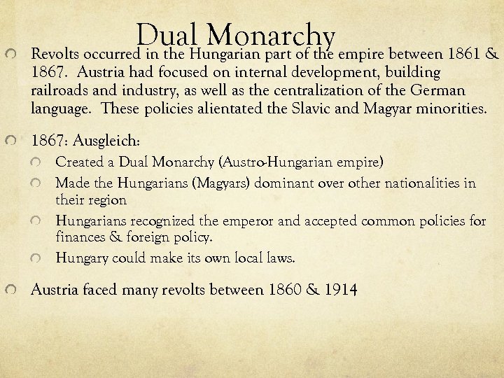 Dual Monarchy empire between 1861 & Revolts occurred in the Hungarian part of the 1867. Austria had focused on internal development, building railroads and industry, as well as the centralization of the German language. These policies alientated the Slavic and Magyar minorities. 1867: Ausgleich: Created a Dual Monarchy (Austro-Hungarian empire) Made the Hungarians (Magyars) dominant over other nationalities in their region Hungarians recognized the emperor and accepted common policies for finances & foreign policy. Hungary could make its own local laws. Austria faced many revolts between 1860 & 1914