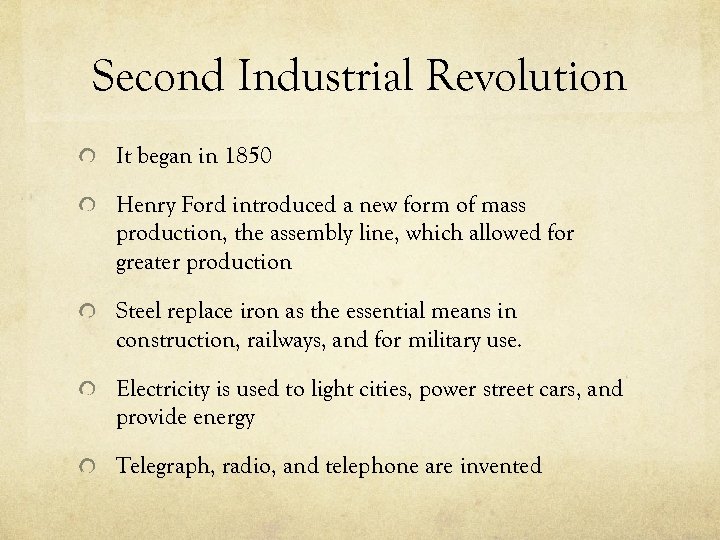 Second Industrial Revolution It began in 1850 Henry Ford introduced a new form of mass production, the assembly line, which allowed for greater production Steel replace iron as the essential means in construction, railways, and for military use. Electricity is used to light cities, power street cars, and provide energy Telegraph, radio, and telephone are invented