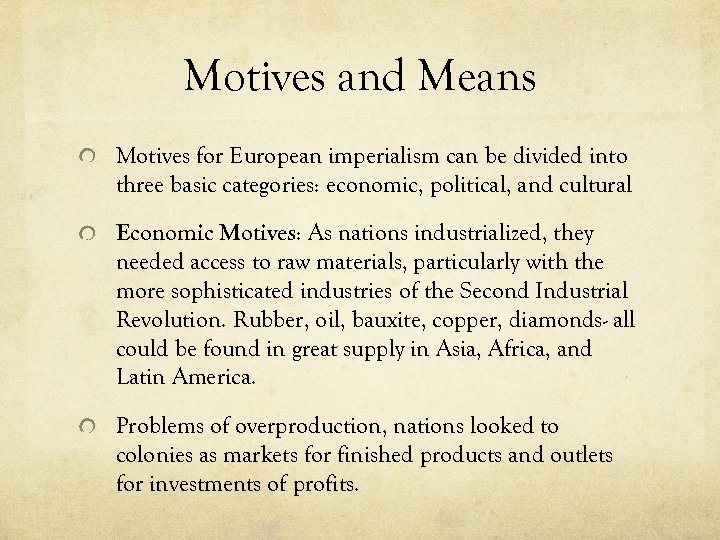 Motives and Means Motives for European imperialism can be divided into three basic categories: economic, political, and cultural Economic Motives: As nations industrialized, they needed access to raw materials, particularly with the more sophisticated industries of the Second Industrial Revolution. Rubber, oil, bauxite, copper, diamonds- all could be found in great supply in Asia, Africa, and Latin America. Problems of overproduction, nations looked to colonies as markets for finished products and outlets for investments of profits.