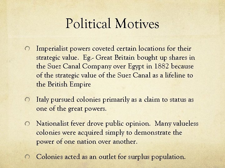 Political Motives Imperialist powers coveted certain locations for their strategic value. Eg. - Great Britain bought up shares in the Suez Canal Company over Egypt in 1882 because of the strategic value of the Suez Canal as a lifeline to the British Empire Italy pursued colonies primarily as a claim to status as one of the great powers. Nationalist fever drove public opinion. Many valueless colonies were acquired simply to demonstrate the power of one nation over another. Colonies acted as an outlet for surplus population.