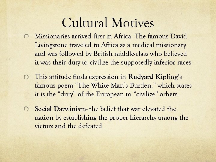Cultural Motives Missionaries arrived first in Africa. The famous David Livingstone traveled to Africa as a medical missionary and was followed by British middle-class who believed it was their duty to civilize the supposedly inferior races. This attitude finds expression in Rudyard Kipling’s famous poem “The White Man’s Burden, ” which states it is the “duty” of the European to “civilize” others. Social Darwinism- the belief that war elevated the nation by establishing the proper hierarchy among the victors and the defeated