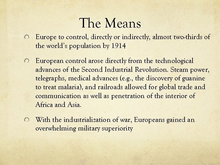 The Means Europe to control, directly or indirectly, almost two-thirds of the world’s population by 1914 European control arose directly from the technological advances of the Second Industrial Revolution. Steam power, telegraphs, medical advances (e. g. , the discovery of guanine to treat malaria), and railroads allowed for global trade and communication as well as penetration of the interior of Africa and Asia. With the industrialization of war, Europeans gained an overwhelming military superiority