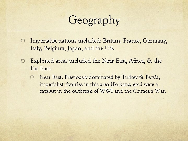 Geography Imperialist nations included: Britain, France, Germany, Italy, Belgium, Japan, and the US. Exploited areas included the Near East, Africa, & the Far East. Near East: Previously dominated by Turkey & Persia, imperialist rivalries in this area (Balkans, etc. ) were a catalyst in the outbreak of WWI and the Crimean War.