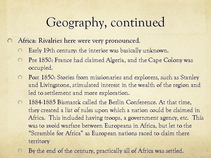 Geography, continued Africa: Rivalries here were very pronounced. Early 19 th century: the interior was basically unknown. Pre 1850: France had claimed Algeria, and the Cape Colony was occupied. Post 1850: Stories from missionaries and explorers, such as Stanley and Livingstone, stimulated interest in the wealth of the region and led to settlement and more exploration. 1884 -1885 Bismarck called the Berlin Conference. At that time, they created a list of rules upon which a nation could be claimed in Africa. This included having troops, a government agency, etc. This was to avoid warfare between Europeans in Africa, but let to the “Scramble for Africa” as European nations raced to claim there territory By the end of the century, practically all of Africa was settled.