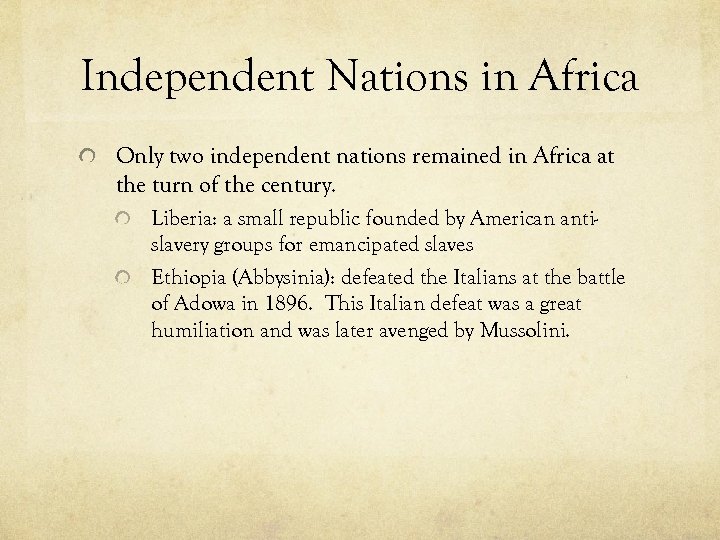 Independent Nations in Africa Only two independent nations remained in Africa at the turn of the century. Liberia: a small republic founded by American antislavery groups for emancipated slaves Ethiopia (Abbysinia): defeated the Italians at the battle of Adowa in 1896. This Italian defeat was a great humiliation and was later avenged by Mussolini.