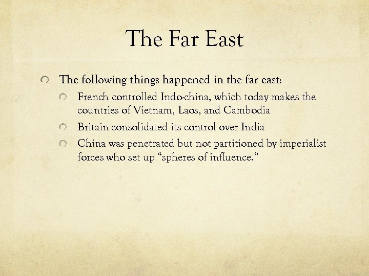 The Far East The following things happened in the far east: French controlled Indo-china, which today makes the countries of Vietnam, Laos, and Cambodia Britain consolidated its control over India China was penetrated but not partitioned by imperialist forces who set up “spheres of influence. ”