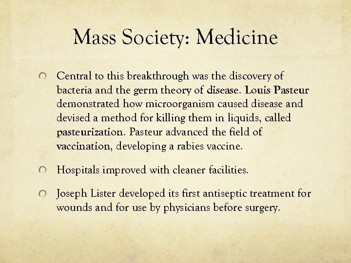 Mass Society: Medicine Central to this breakthrough was the discovery of bacteria and the germ theory of disease. Louis Pasteur demonstrated how microorganism caused disease and devised a method for killing them in liquids, called pasteurization. Pasteur advanced the field of vaccination, developing a rabies vaccine. Hospitals improved with cleaner facilities. Joseph Lister developed its first antiseptic treatment for wounds and for use by physicians before surgery.