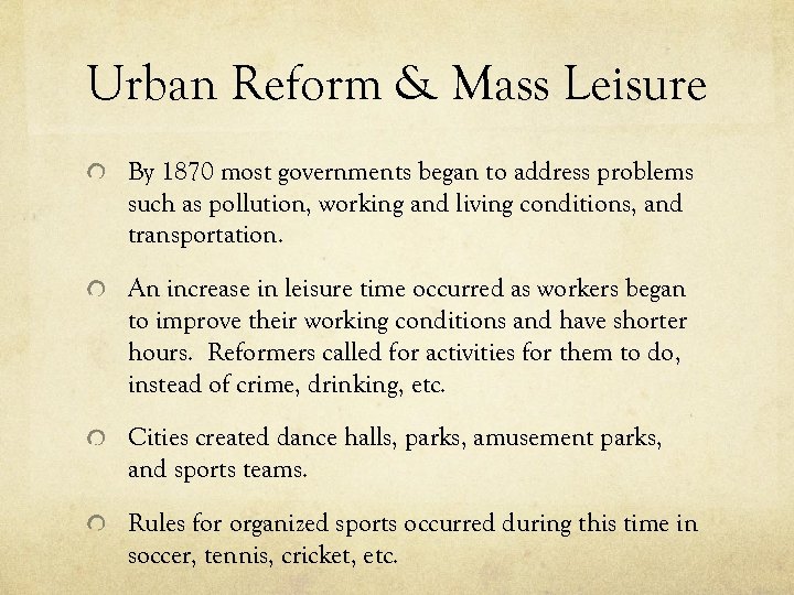 Urban Reform & Mass Leisure By 1870 most governments began to address problems such as pollution, working and living conditions, and transportation. An increase in leisure time occurred as workers began to improve their working conditions and have shorter hours. Reformers called for activities for them to do, instead of crime, drinking, etc. Cities created dance halls, parks, amusement parks, and sports teams. Rules for organized sports occurred during this time in soccer, tennis, cricket, etc.
