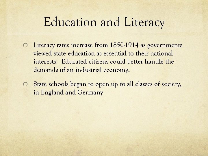 Education and Literacy rates increase from 1850 -1914 as governments viewed state education as essential to their national interests. Educated citizens could better handle the demands of an industrial economy. State schools began to open up to all classes of society, in England Germany