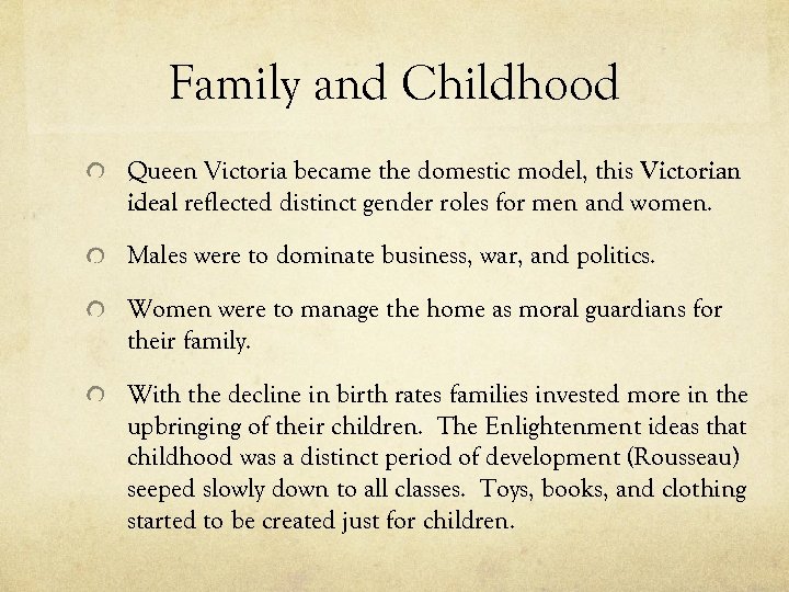 Family and Childhood Queen Victoria became the domestic model, this Victorian ideal reflected distinct gender roles for men and women. Males were to dominate business, war, and politics. Women were to manage the home as moral guardians for their family. With the decline in birth rates families invested more in the upbringing of their children. The Enlightenment ideas that childhood was a distinct period of development (Rousseau) seeped slowly down to all classes. Toys, books, and clothing started to be created just for children.
