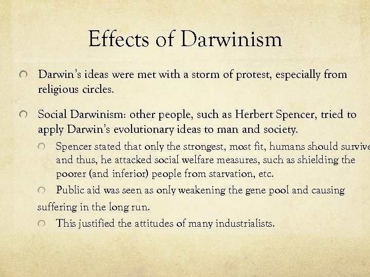 Effects of Darwinism Darwin’s ideas were met with a storm of protest, especially from religious circles. Social Darwinism: other people, such as Herbert Spencer, tried to apply Darwin’s evolutionary ideas to man and society. Spencer stated that only the strongest, most fit, humans should survive and thus, he attacked social welfare measures, such as shielding the poorer (and inferior) people from starvation, etc. Public aid was seen as only weakening the gene pool and causing suffering in the long run. This justified the attitudes of many industrialists.