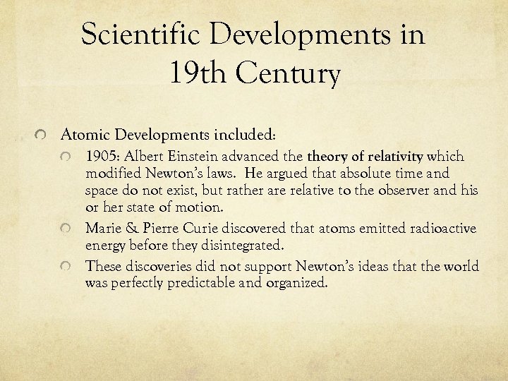 Scientific Developments in 19 th Century Atomic Developments included: 1905: Albert Einstein advanced theory of relativity which modified Newton’s laws. He argued that absolute time and space do not exist, but rather are relative to the observer and his or her state of motion. Marie & Pierre Curie discovered that atoms emitted radioactive energy before they disintegrated. These discoveries did not support Newton’s ideas that the world was perfectly predictable and organized.