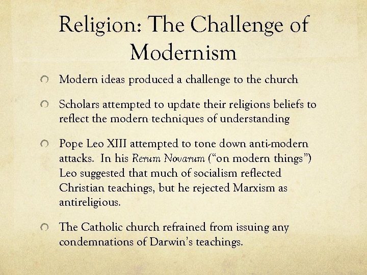 Religion: The Challenge of Modernism Modern ideas produced a challenge to the church Scholars attempted to update their religions beliefs to reflect the modern techniques of understanding Pope Leo XIII attempted to tone down anti-modern attacks. In his Rerum Novarum (“on modern things”) Leo suggested that much of socialism reflected Christian teachings, but he rejected Marxism as antireligious. The Catholic church refrained from issuing any condemnations of Darwin’s teachings.