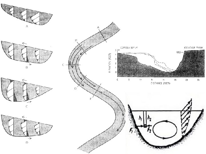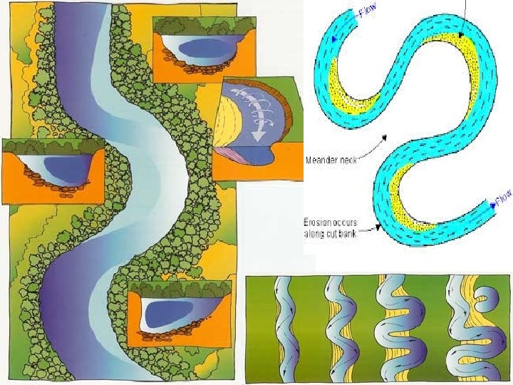 K=L/ λ Cele mai multe râuri au K ≈ 1. 5 Rc=L/(6 ω) Cele mai multe râuri au Rc/W între 2 -3 Caracteristicile meandrelor: Rc- raza de curbură λ – lungimea de undă L – lungimea meandrului W- lăţimea meandrului