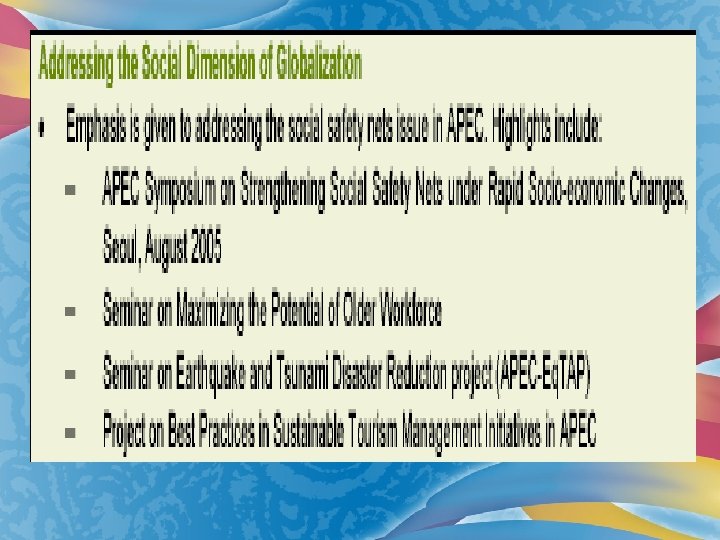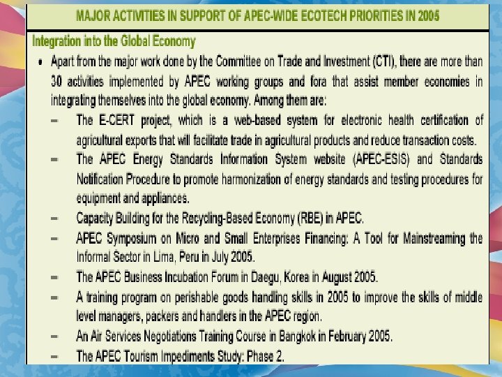 APEC-wide ECOTECH priorities (2003) 1. Integration into Global Economy 2. Counter-Terrorism Capacity Building 3. Promoting the Development of Knowledge. Based Economies 4. Addressing the Social Dimension of Globalization
