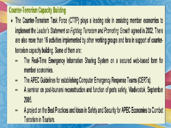 16. Counter Terrorism Task Force (CTTF): v Coordinate the implementation of the Leaders’ and Ministers Statements v Assist economies to identify and assess their Counter. Terrorism needs v Coordinate capacity-building and technical assistance programs, including through appropriate consultations with IFIs v Cooperate with relevant international organizations to advance the implementation of Leaders/Ministers instructions and avoid unnecessary duplication of efforts v Facilitate cooperation among APEC fora on counterterrorism issues and assist in making recommendations on proposals/projects to Senior Officials