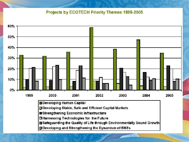 ECOTECH priority themes (1996) 1. 2. 3. 4. 5. Developing Human Capital Developing Stable, Safe and Efficient Capital Market Strengthening Economic Infrastructure Harnessing Technologies for the Future Safeguarding Quality of Life through Environmentally Sound Growth 6. Developing and Strengthening the Dynamism of Small and Medium Enterprises (SME’s)