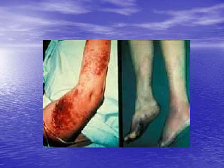 Геморрагический синдром • Возникает первым и зависит от количества • • тромбоцитов, резко выражен. Проявляется петехиальной сыпью, экхимозами, носовыми кровотечениями, кровоточивостью слизистых – микроциркуляторный тип кровоточивости (петехиально-петнистый). Непосредственной причиной смерти у таких больных чаще всего являются кровоизлияния в жизненно важные органы.