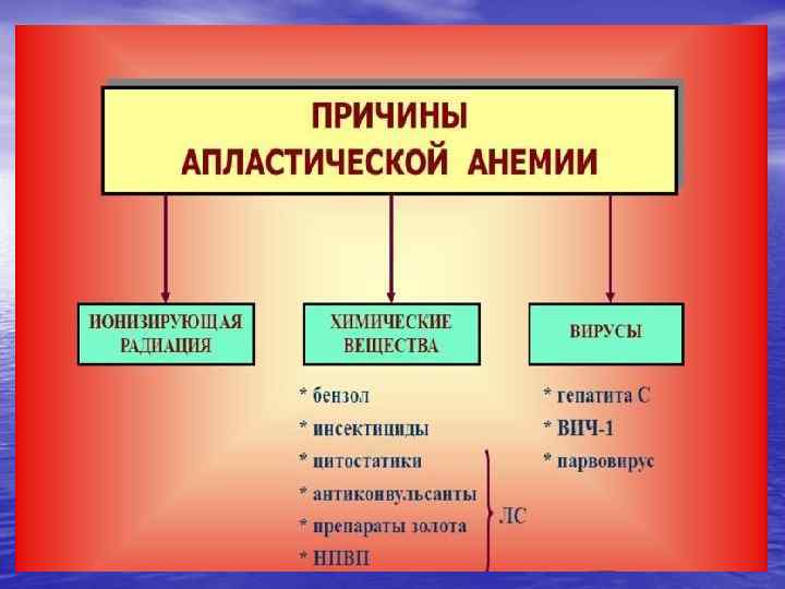2. Трехостковая панцитопения: • 2. 1. Врожденная: • 2. 1. 1. анемия Фанкони (связанная с • • • хромосомными поломками); 2. 1. 2. семейные апластические анемии (несвязанные с хромосомными поломками, но со стигмальными нарушениями); 2. 1. 3. врожденный дизкератоз; 2. 1. 4. апластические анемии с врожденными хромосомными нарушениями; 2. 1. 5. синдром Дубовица (врожденные аномалии, умственная отсталость); 2. 1. 6. синдром Швахмана-Даймонда. • • • 2. 2. Приобретенные панцитопении: 2. 2. 1. идиопатические; 2. 2. 2. вторичные: 2. 2. 2. 1. облучение; 2. 2. лекарства и химикаты: цитотоксические, бензин, хлорамфеникол, противовоспалительные, противосудоржные, препараты золота; 2. 2. 2. 3. Вирусы: ВЭБ, гепатиты, парвовирусы, ВИЧ; 2. 2. 2. 4. иммунные заболевания: 2. 2. 2. 5. эозинофильный фасцит; 2. 2. 2. 6. гипоиммуноглобулинемия; 2. 2. 2. 7. тимома; 2. 2. 2. 8. ПНГ; 2. 2. 2. 9. прелейкемия