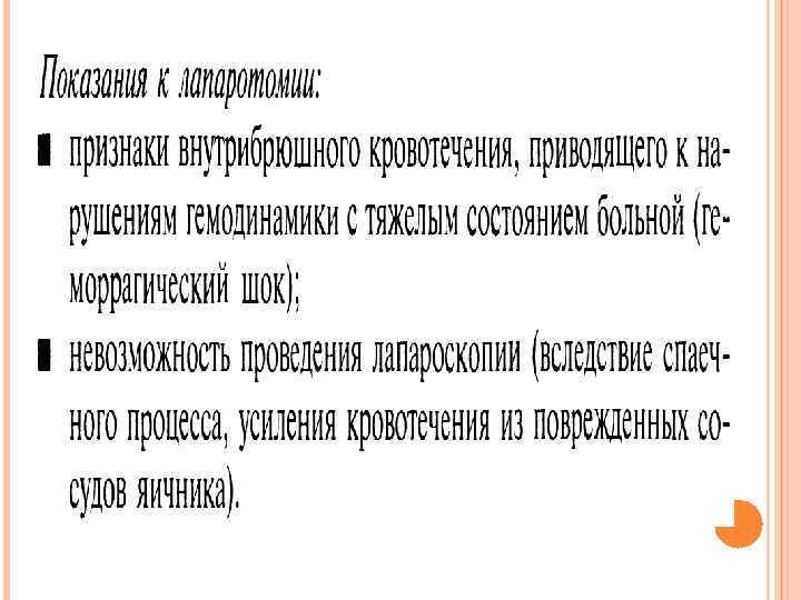 ПОКАЗАНИЯ К ГОСПИТАЛИЗАЦИИ При подозрении на апоплексию яичника показана госпитализация в гинекологический стационар в экстренном порядке. Необходим дифференцированный подход при выборе метода лечения.