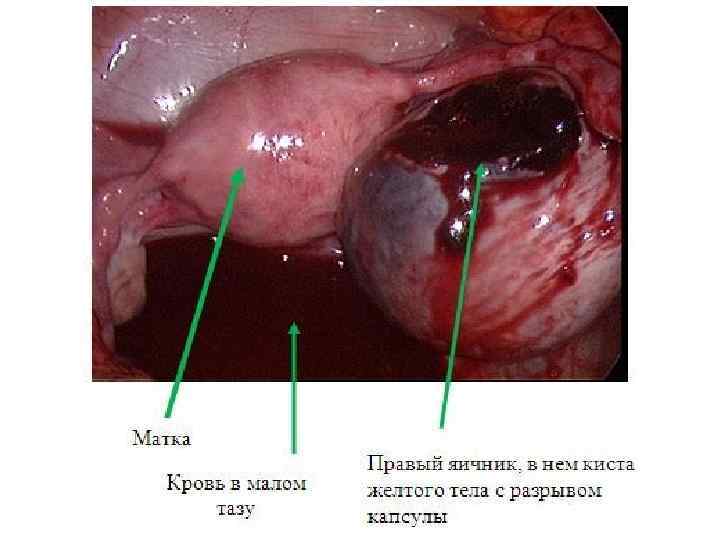 Патогенез • Повреждается сосуд яичника. Кровь, достигнув места наименьшего сопротивления, разрушает новообразованную ткань на месте овуляционного отверстия и изливается в брюшную полость. • Гематома кистозной полости, расположенная вблизи от поверхности яичника, может лопнуть, разорвав белочную оболочку. • Корковый и мозговой слои, имеющие рыхлую строму, пропитываясь кровью увеличиваются в объеме. Белочная оболочка, лишенная эластических элементов и сосудов нерастяжима, рвется под давлением, образуя щель. В этом случае размеры отверстия от точечных до размеров длины яичника (от 0, 5 до 2, 5 см)
