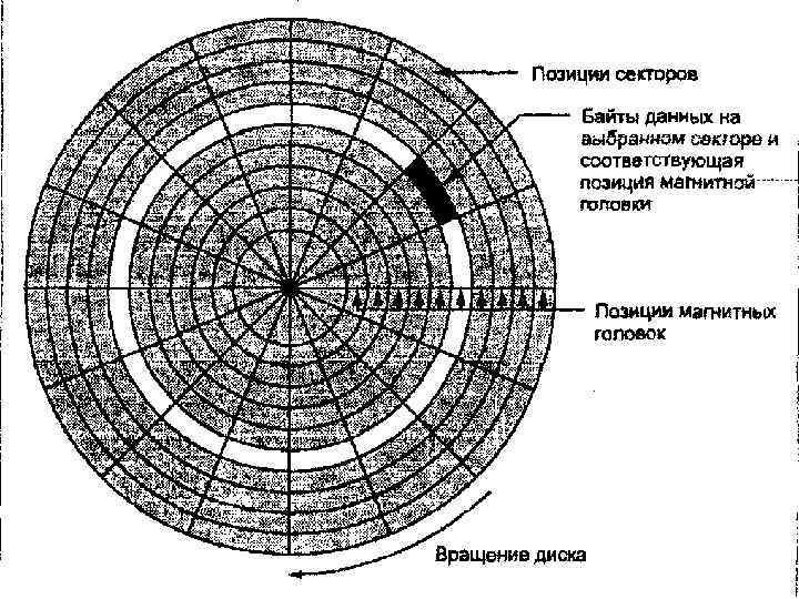 Информация считывается с пластин и записывается на них с помощью магнитных головок. Каждая головка описывает окружность над поверхностью диска – дорожку (трек). Дорожка же в свою очередь делится на секторы. Позиционирующее устройство устанавливает все головки таким образом, что вместе они описывают цилиндр. ¡ Номер цилиндра, магнитной головки (дорожки) и номер сектора однозначно идентифицируют данные. Этот блок данных и называется сектором. Размер сектора составляет 512 байт. ¡ Комбинация двух или более секторов на одной дорожке образуют кластер. Число байтов в кластере зависит от размера диска и программы, с помощью которой форматируется диск. Каждый кластер имеет свой уникальный адрес. Головка чтения записи при поиске адреса нужного кластера движется над вращающимся диском и читает магнитные метки, чтобы определить свое местоположение на магнитной поверхности.