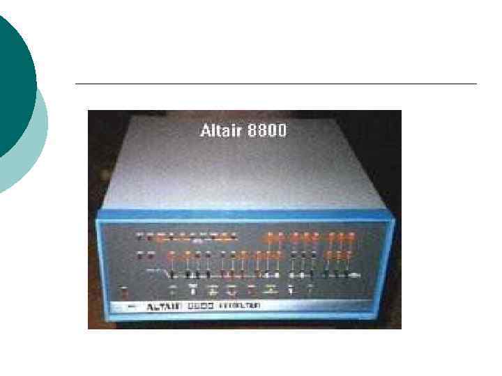 ¡ В 1974 г. несколько фирм объявили о создании на основе микропроцессора Intel— 8008 компьютера, т. е. устройства, выполняющего те же функции, что и большая ЭВМ. ¡ В начале 1975 г. появился первый коммерчески распространяемый компьютер Альтаир 8800, построенный на основе микропроцессора Intel 8080. Этот компьютер, разработанный фирмой MITS, продавался по цене около 500 дол. Возможности его были весьма ограничены оперативная память составляла всего байт, клавиатура и экран отсутствовали. ¡ В конце 1975 г. Пол Аллен и Билл Гейтс (будущие основатели фирмы Microsoft) создали для компьютера «Альтаир» интерпретатор языка Basic. Многие фирмы также занялись производством персональных компьютеров. Компьютеры стали продаваться уже в полной комплектации, с клавиатурой и монитором, спрос на них составил десятки, а затем и сотни тысяч штук в год.