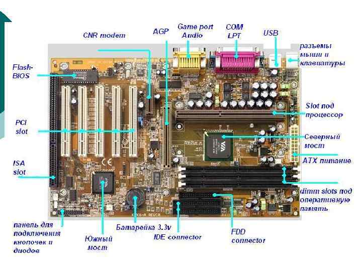 Основные компоненты, установленные на материнской плате: ¡ ЦПУ ¡ набор системной логики (англ. chipset). Как правило, современные наборы системной логики строятся на базе двух СБИС: «северного» и «южного мостов» . § Северный мост ( «англ. Northbridge» ), MCH (Memory controller hub), системный контроллер — обеспечивает подключение ЦПУ к узлам, использующим высокопроизводительные шины: ОЗУ, графический контроллер. § Южный мост ( «англ. Southbridge» ), ICH (I/O controller hub), периферийный контроллер — содержит контроллеры периферийных устройств (жёсткого диска, Ethernet, аудио), контроллеры шин для подключения периферийных устройств (шины PCI, PCI Express и USB), а также контроллеры шин, к которым подключаются устройства, не требующие высокой пропускной способности: последовательного и параллельного интерфейсов, контроллера клавиатуры и мыши). ¡ ОЗУ ¡ загрузочное ПЗУ — хранит ПО, которое исполняется сразу после включения питания. Как правило, загрузочное ПЗУ содержит BIOS.