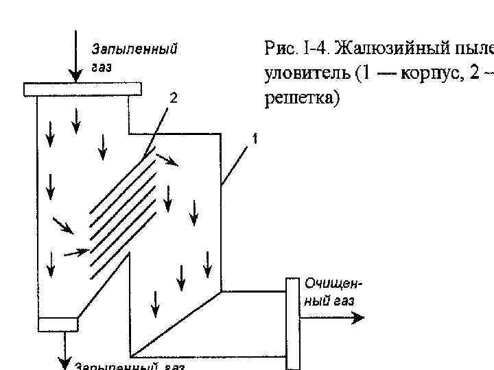 ЖАЛЮЗИЙНЫЕ АППАРАТЫ Эти аппараты имеют жалюзийную решетку, состоящую из рядов пластин или колец. Очищаемый газ, проходя через решетку, делает резкие повороты. Пылевые частицы вследствие инерции стремятся сохранить первоначальное направление, что приводит к отделению крупных частиц из газового потока, тому же способствуют их удары о наклонные плоскости решетки, от которых они отражаются и отскакивают в сторону от щелей между лопастями жалюзи. В результате газы делятся на два потока.