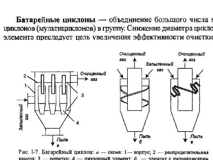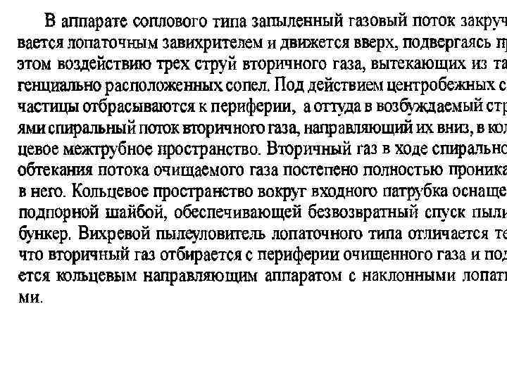 АППАРАТЫ СУХОГО ТИПА К сухим механическим пылеуловителям относят аппараты, которых использованы различные механизмы осаждения гравитационный (пылеосадительные камеры), инерционный (камера осаждения пыли в которых происходит в результате изменения направления движения газового потока или установки на его пути препятствия) и центробежный (одиночные, групповые и батарейные циклоны, вихревые и динамические пылеуловители). Перечисленные аппараты отличаются простотой изготовления и эксплуатации, их достаточно широко используют в промышленности. Однако эффективность улавливания в них пыли не всегда оказывается достаточной, в связи с чем они часто выполняют роль аппаратов предварительной очистки газ