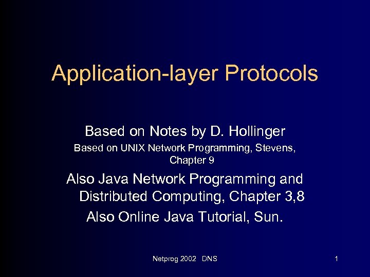 Application-layer Protocols Based on Notes by D. Hollinger Based on UNIX Network Programming, Stevens, Chapter 9 Also Java Network Programming and Distributed Computing, Chapter 3, 8 Also Online Java Tutorial, Sun. Netprog 2002 DNS 1