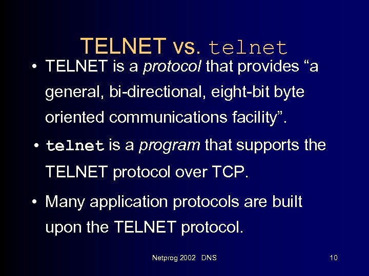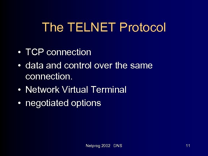 TELNET vs. telnet • TELNET is a protocol that provides “a general, bi-directional, eight-bit byte oriented communications facility”. • telnet is a program that supports the TELNET protocol over TCP. • Many application protocols are built upon the TELNET protocol. Netprog 2002 DNS 10