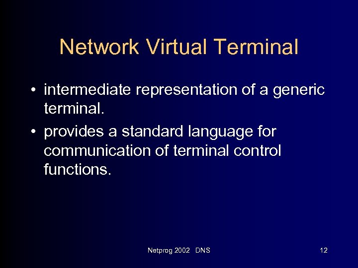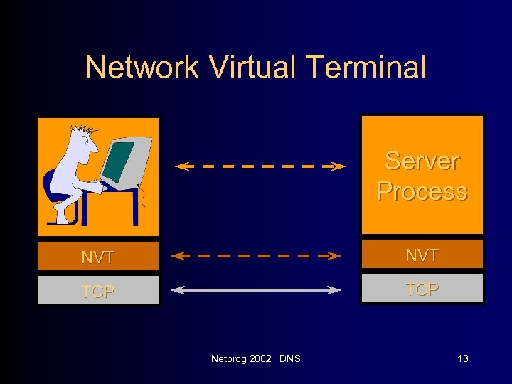 Network Virtual Terminal • intermediate representation of a generic terminal. • provides a standard language for communication of terminal control functions. Netprog 2002 DNS 12