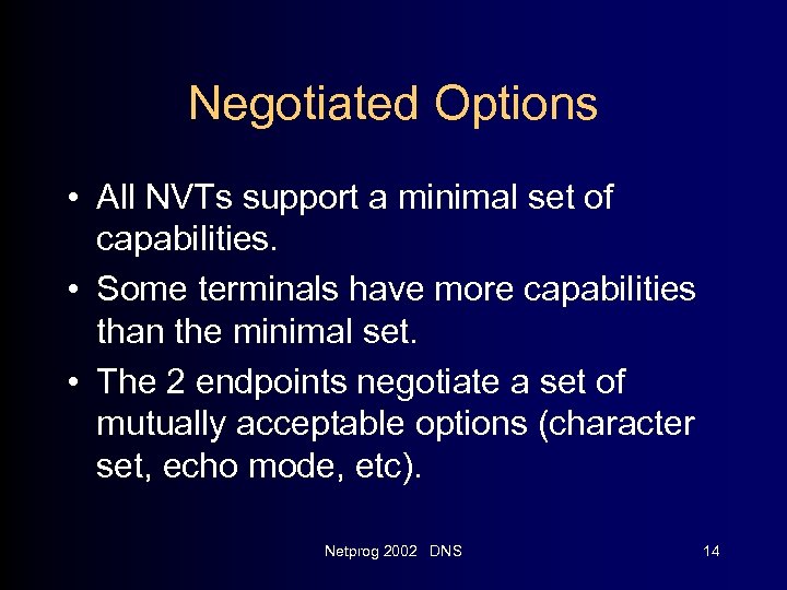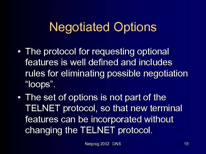 Negotiated Options • All NVTs support a minimal set of capabilities. • Some terminals have more capabilities than the minimal set. • The 2 endpoints negotiate a set of mutually acceptable options (character set, echo mode, etc). Netprog 2002 DNS 14