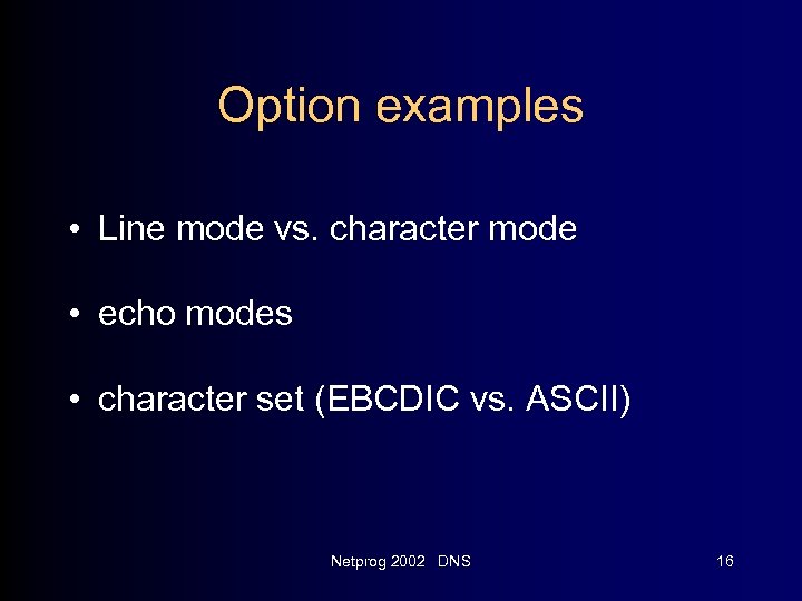 Option examples • Line mode vs. character mode • echo modes • character set (EBCDIC vs. ASCII) Netprog 2002 DNS 16