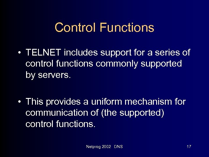 Negotiated Options • The protocol for requesting optional features is well defined and includes rules for eliminating possible negotiation “loops”. • The set of options is not part of the TELNET protocol, so that new terminal features can be incorporated without changing the TELNET protocol. Netprog 2002 DNS 15