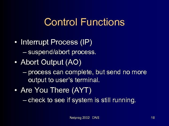 Control Functions • TELNET includes support for a series of control functions commonly supported by servers. • This provides a uniform mechanism for communication of (the supported) control functions. Netprog 2002 DNS 17